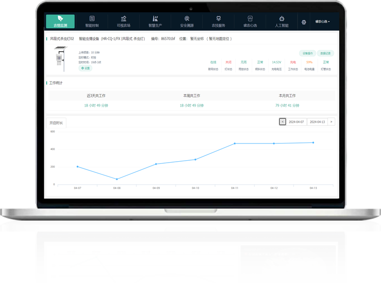 具備光控、雨控、時控 3種智能控制切換模式,實現(xiàn)依據(jù)晝夜、天氣、時段變化自動控制燈光開光和設(shè)備啟停,也可遠程使用電腦/APP隨時隨地聯(lián)網(wǎng)遠程管理,無需人工看管也能智能殺蟲。