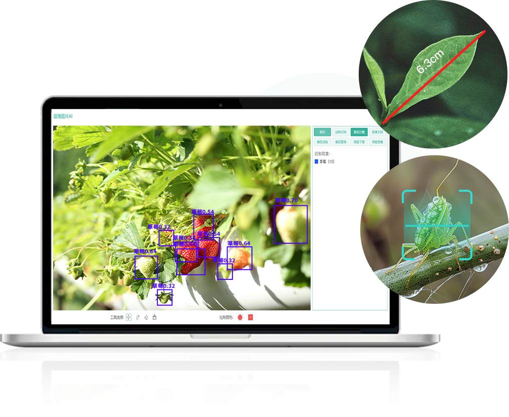 自研AI算法平臺,增強圖像采集、分析計算和數據智能處理能力,提供測定植株高度、葉片大小、識別病蟲害、計算果實數量等功能,更有用戶自主AI模型訓練、推理功能,為作物生產決策、病蟲害識別診斷、產量預估、災害監測等作業需求提供了更精準、更智能的解決方案,高效助力作物生產管理工作。