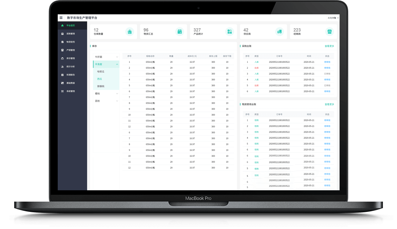 打通種植計劃 > 農(nóng)資采購 > 物資使用 > 產(chǎn)品采收 > 出庫銷售全業(yè)務(wù)流程,提升運營效率。